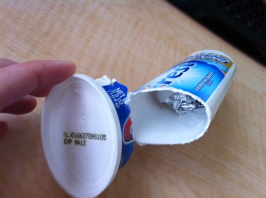 I was curious how this bottle of toothpaste worked. You squeeze it, and toothpaste come out of the top. However, the plastic container is more rigid than a normal toothpaste tube, and the rigidity of the container doesn’t allow you to feel or manipulate the viscous goo within. I had a theory. I couldn’t wait for the toothpaste to run out so I could cut the bottle open.