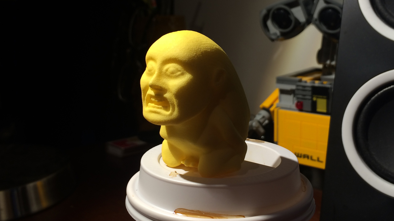 Not bad! Quite good! I had ordered “polished” plastic, and it ain’t polished, but I’m guessing that’s because the details were too fine to be polished, and the Shapeways staff were smart enough to know polishing it would reduce my idol to a meaningless peanut. Instead, it has the rough sandy surface that comes as a default to that sort of printing. Plus the yellow–which I think is just on the surface.