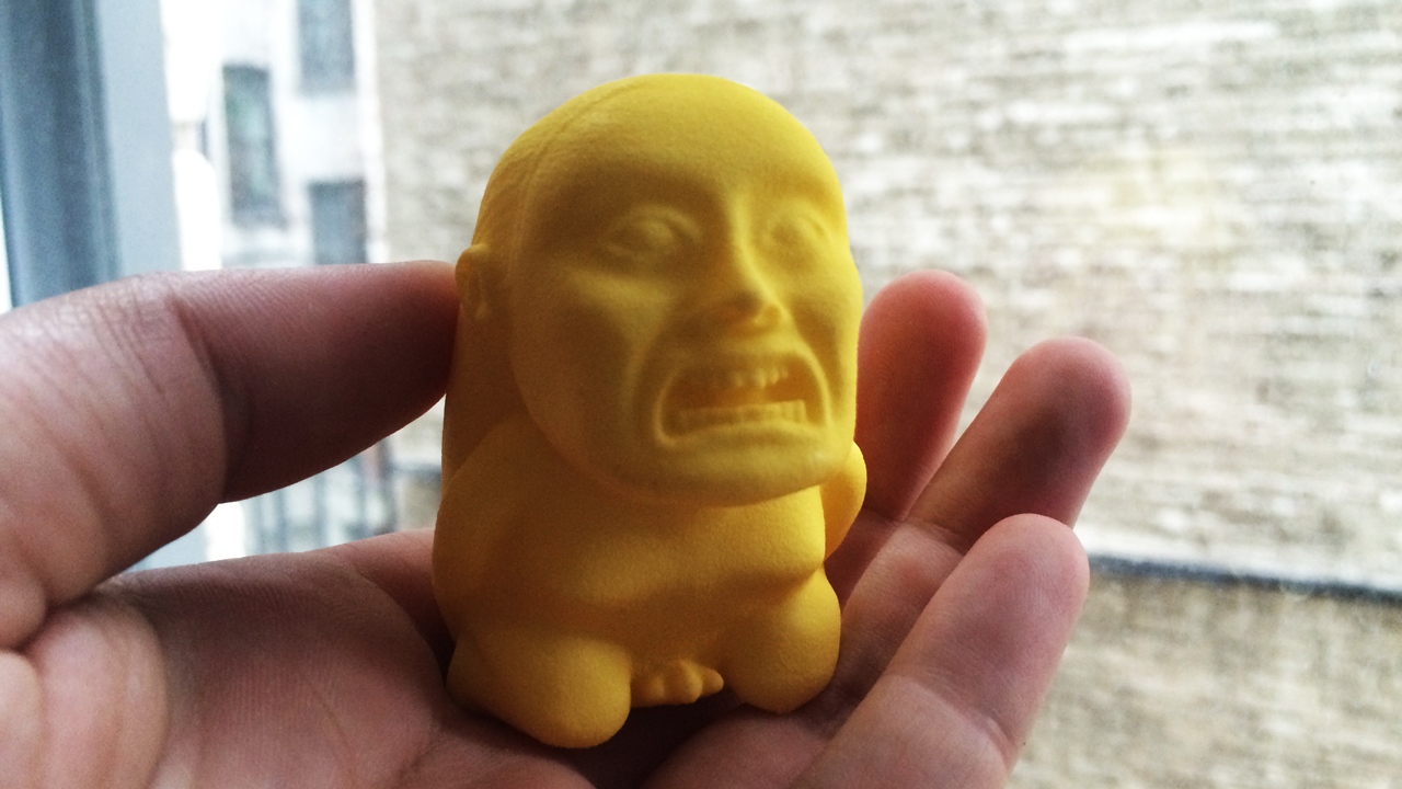 But it just happened to cross my mind recently. Small objects are quite to cheap to print of Shapeways, and they have more material and color options than ever (including actual gold). So I settled on a little 2 in. figure, in yellow plastic, for $25.