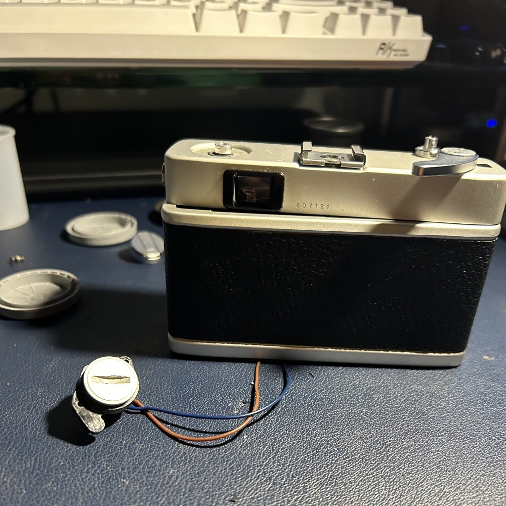 So, instead, I just physically wrapped the bare ends of the wires to the battery contacts Frankenstein-style. Not perfect, but working. The problem, then, was that the longer headphone wires no longer fit inside the camera body without rubbing against some of the moving pieces, rendering it all moot. But it was technically working!