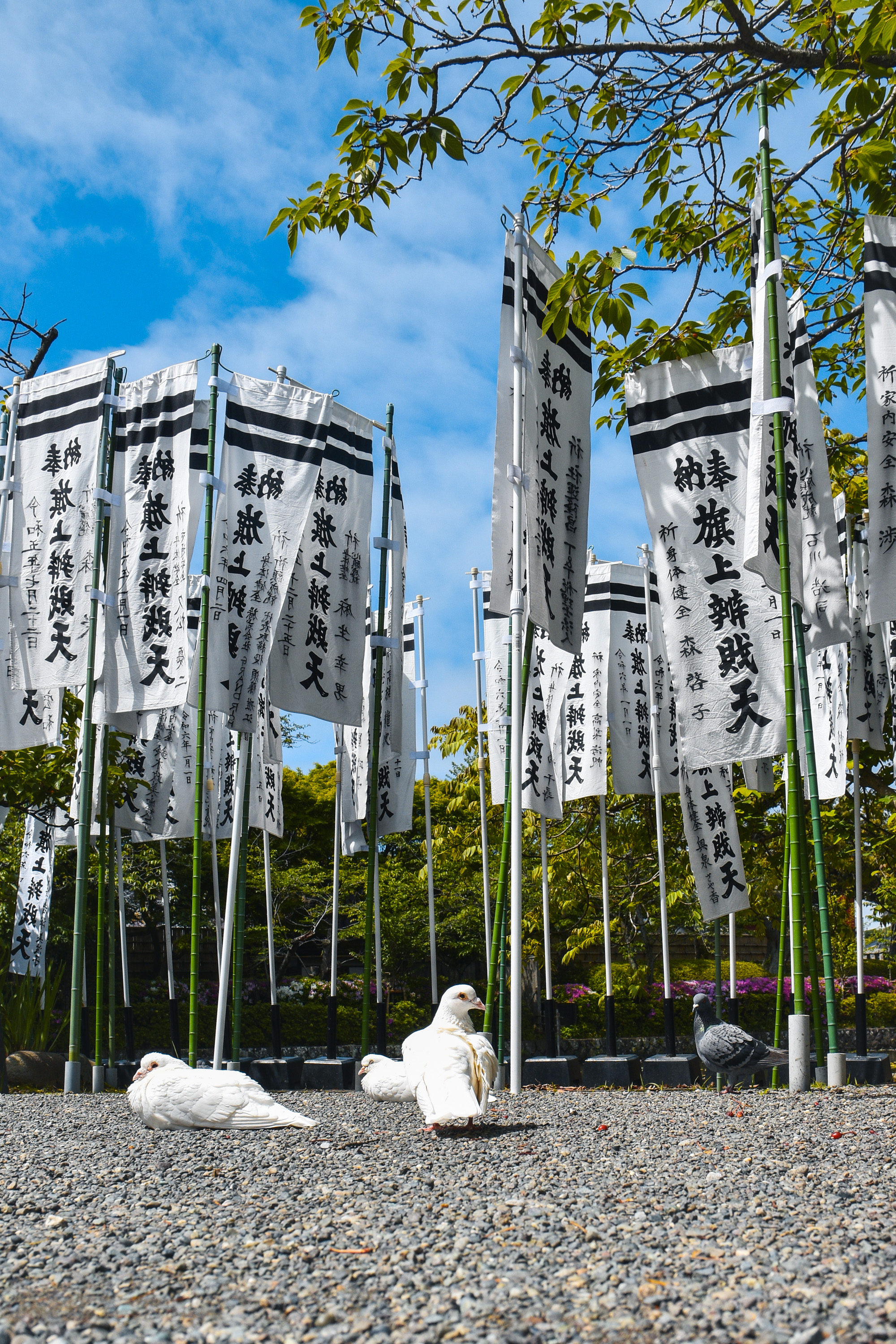 On a small island in a lake in the surrounding gardens, pigeons held court around a small shrine dotted with white and navy blue vertical flags flapping in the wind. The pigeons sat peacefully on the ground, largely ignoring the foot traffic of onlookers like myself. I don’t know their significance. Signs leading up to that shrine made it clear not to bring unleased pets.