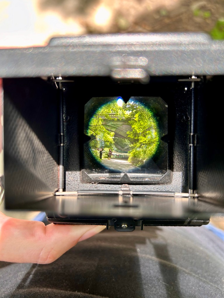 It’s a twin-lens reflex camera, which means that it has two lens: one that you look through, and one that takes the picture. The lenses are mechanically linked so that when you focus one, you are focusing both. And you look down into the camera and shoot from the waist instead of holding it up to your eye.